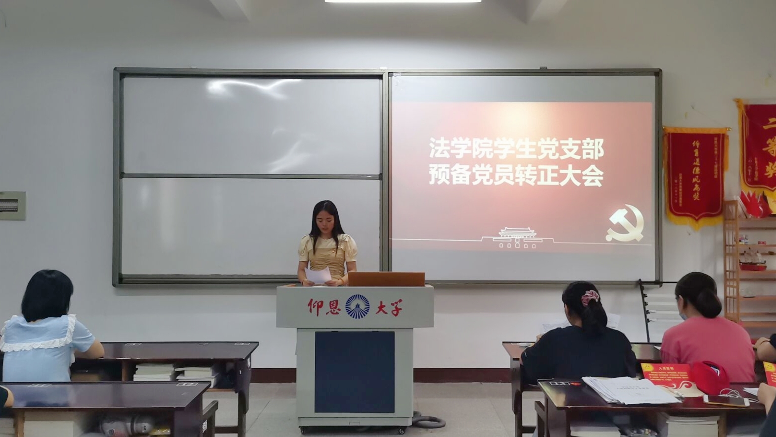 会上,预备党员钟微、姚维萍、张笔彩、陈雨、郑莹莹逐个宣读转正申请书,汇报预备期内自己在学习、思想、生活、工作等方面的情况。期间,入党介绍人根据各预备党员的培养考察情况做出介绍,与会党员对5位预备党员的转正问题进行了充分的讨论,并发表态度。经全体与会正式党员举手表决,5名预备党员均全票通过,同意按期转为中共正式党员。此外,支部还为转正党员准备了“政治生日”贺卡;并在林曼婷同志的带领下,转正党员右手握拳举过肩头,面对鲜红的党旗进行庄严宣誓。