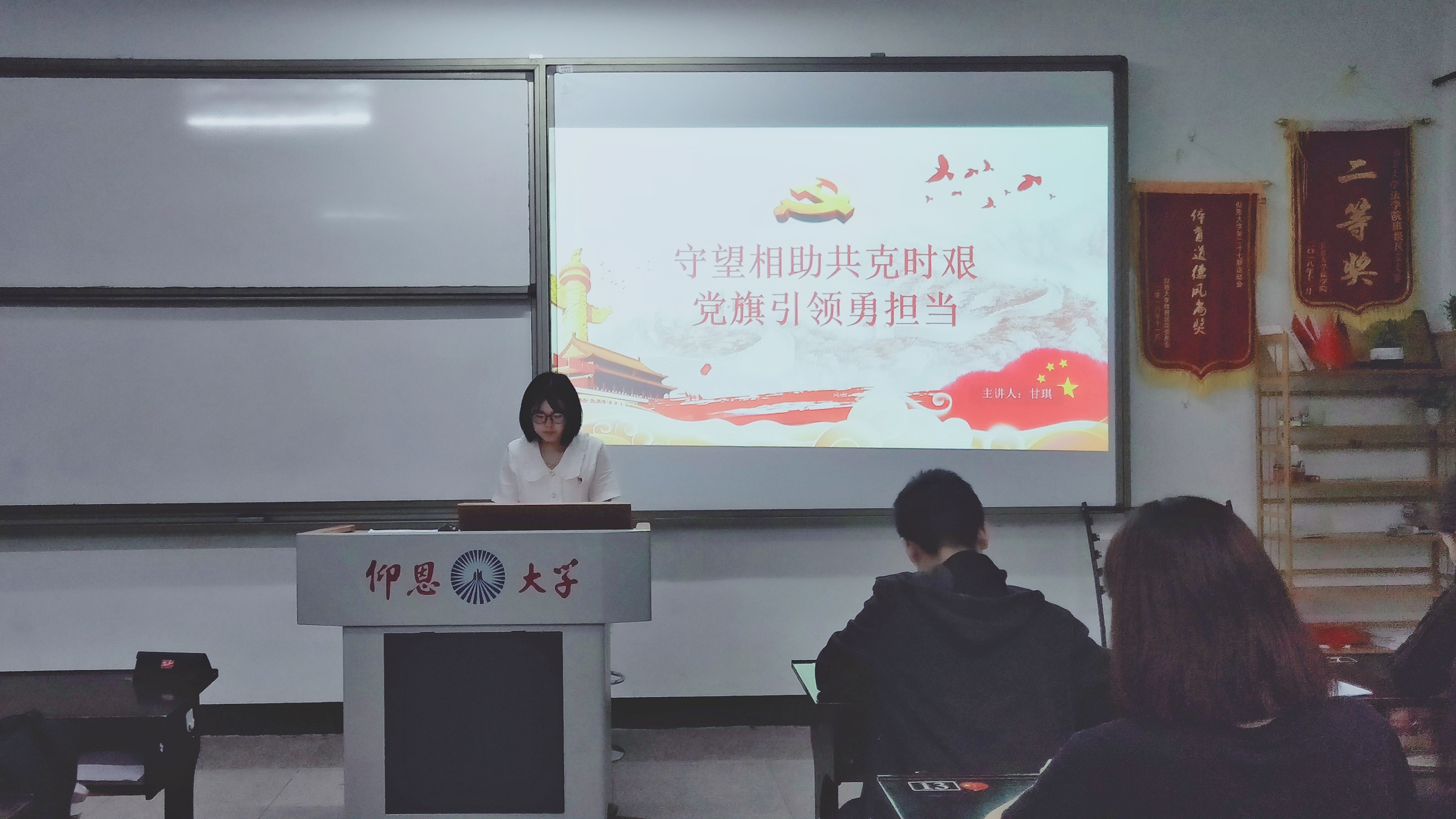 此专题活动主要以“守望相助共克时艰,党旗引领勇担当”为主题,强调党员充分发挥引领作用。会上,陈雨、高宸铎等同志分别从“中国抗疫时间线”与“中国在全球抗疫中体现大国担当”方面展开,论述了在这场与时间赛跑、与病毒抗争的战“疫”中,党员深知责在肩,使命在前。一个党员就是一面旗帜,一个支部就是一座堡垒,作为大学生党员应当发挥战斗堡垒作用和旗帜引领作用,让党徽在疫情阴霾中熠熠生辉,让党旗在战“疫”一线高高扬起!