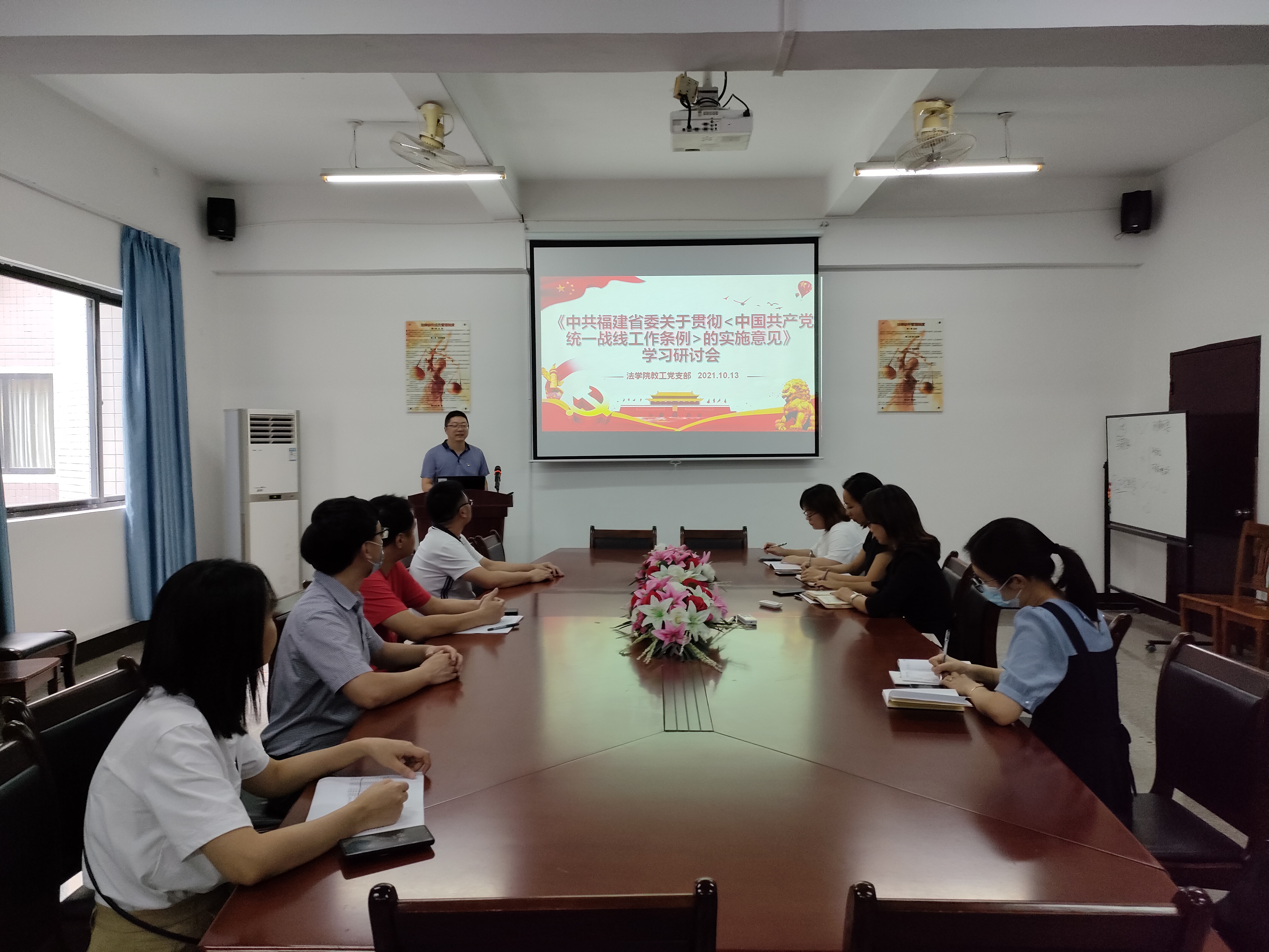 10月13日下午,于304永利集团第三校区普照教学楼法律诊所,永利3044集团教工党支部召开《中共福建省委关于贯彻<中国共产党统一战线工作条例>的实施意见》学习研讨会,永利3044集团全体党员教师参加了此次活动。