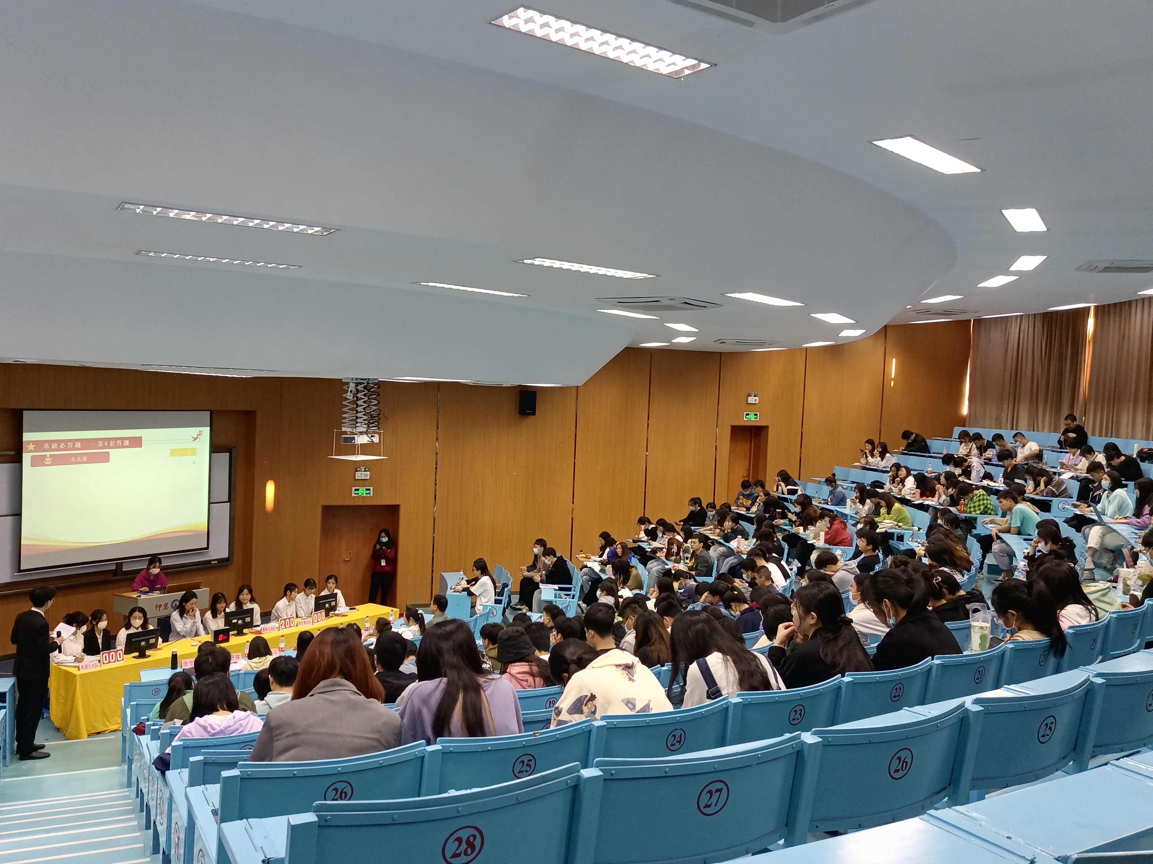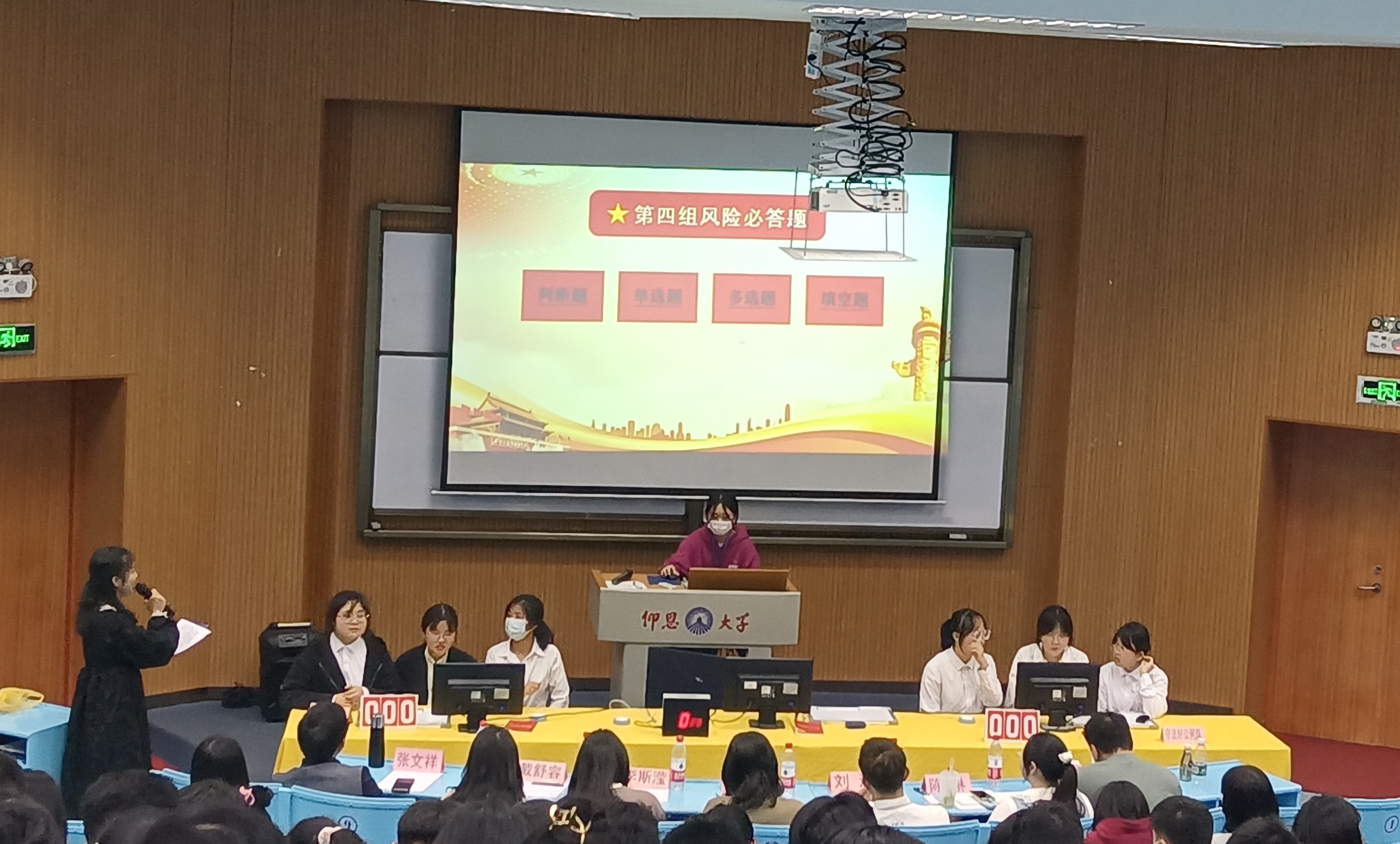 此次比赛由七个学院各派一支代表队参与,共有三轮赛程,采取积分制,分为“基础必答题”、“风险抢答题”、“险必答题”三个环节。各参赛队在必答题、抢答题等环节展开了激烈角逐,比赛精彩纷呈、各参赛队比分交替上升,现场气氛异常热烈。在“风险必答题”环节中,各支队伍的“弯道超车”更是将比赛推向高潮。选手们沉着冷静、条理分明的答题展示了丰富的宪法知识储备,赢得了在场老师和同学们的阵阵喝彩。