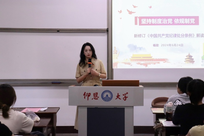为贯彻落实全面从严治党要求,引导广大党员真正做到“学纪、知纪、明纪、守纪”。6月24日,永利3044集团党总支书记兼副院长杨勤于普照楼204为全体学生党员开展“《中国共产党纪律处分条例》解读”主题党课,支部全体学生党员参加。