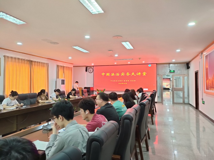 为深入学习贯彻习近平法治思想,贯彻落实党的二十大精神和党的二十届三中全会精神,贯彻落实全国教育大会精神,完善以实践为导向的永利3044集团校教育培养机制,提升法学人才自主培养质量。中央依法治国办、教育部、司法部于2024年10月17日上午在中国人民大学联合举办中国法治实务大讲堂,我校在新区行政楼会议室设立分会场,组织师生收看中国法治实务大讲堂启动仪式暨第一讲。