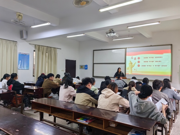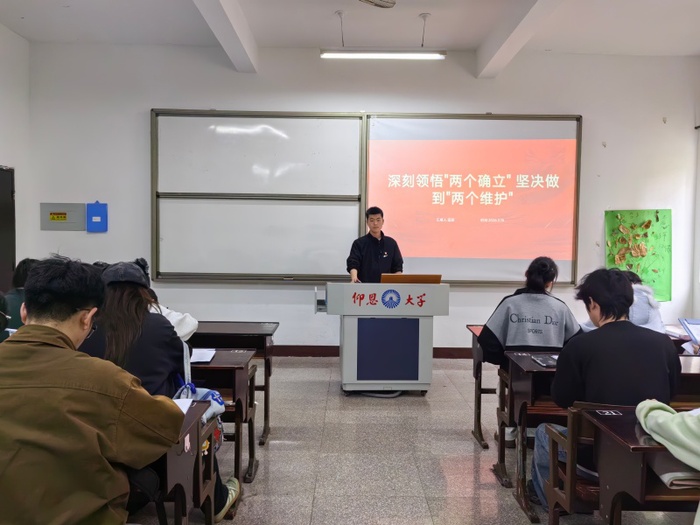 课上,由蓝超同志以“深刻领悟‘两个确立’的决定性意义”为切入点,结合党的百年奋斗历程,从历史逻辑、理论逻辑与实践逻辑三个维度,深入剖析“两个确立”是新时代取得一切成就最根本的保证。他通过梳理关键历史节点,生动阐释了“两个确立”对于凝聚全党意志、指引前行方向的核心作用。随后,高朱怡同志围绕“坚决做到‘两个维护’”展开讲解。她聚焦政治忠诚与行动自觉,强调“两个维护”是具体的、实践的,要求党员同志将政治要求转化为学习与生活中的实际行动,尤其要结合法学专业特色,在法治实践中坚定维护国家利益与人民权益。